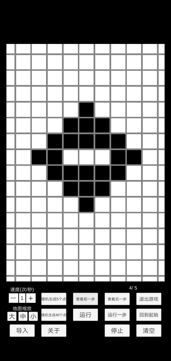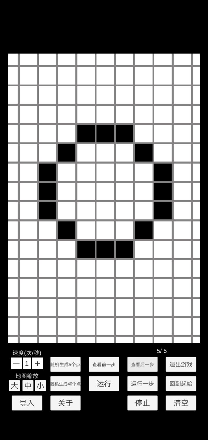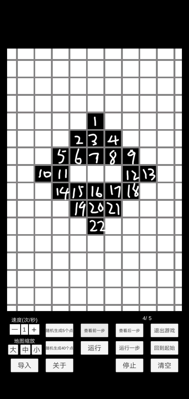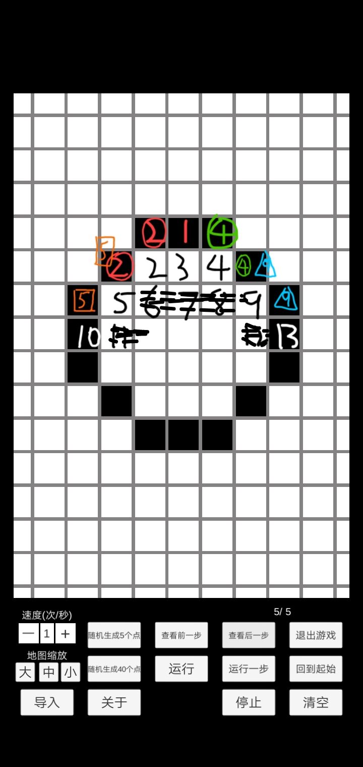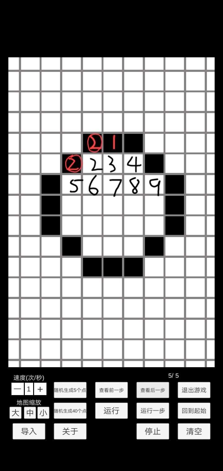 5号周围有4个方块细胞,很明显超过了2/3个的限制,所以5号也要移位繁衍。