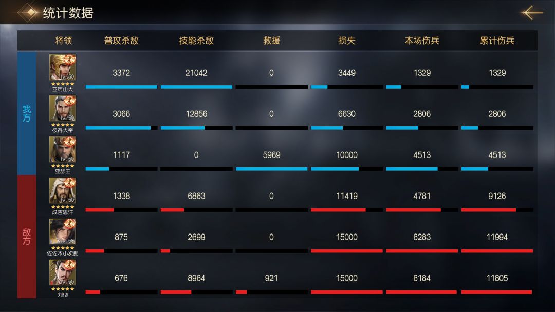 光靠反击会让伤害比较分散,所以另一名副将优先选择输出类将领,彼得大帝的自带技能伤害率虽然不高,但可利用力量差触发附加效果,让敌方在本回合内为他分担伤害,即提高了输出效率又降低了承受伤害,与亚历山大成为相似的兼并坦度和输出的将领。