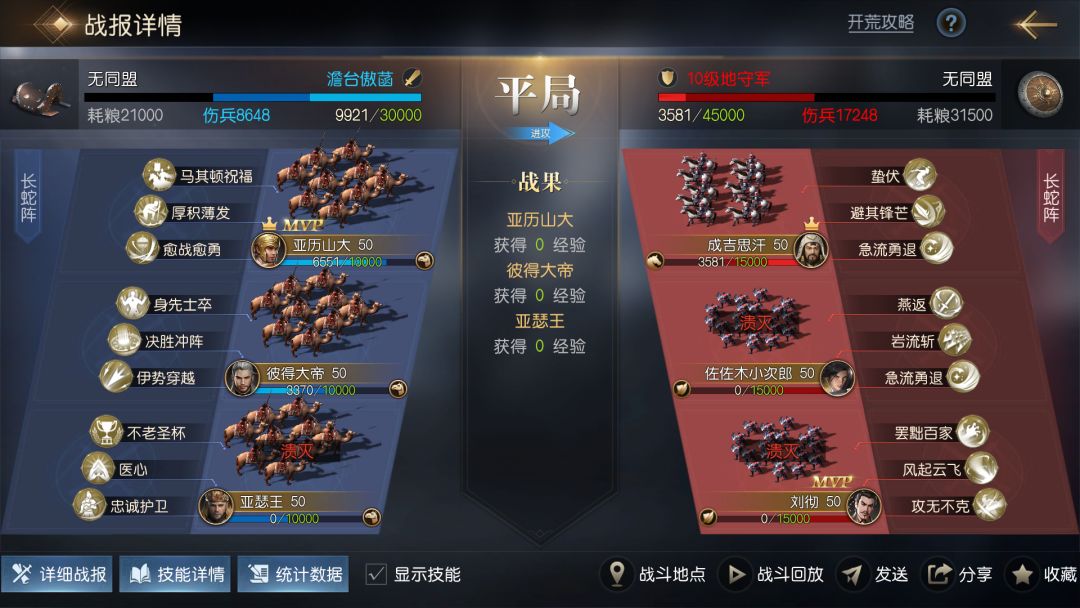 通过战报可以看出,该阵容不仅对主打开局爆发的菜刀队有较好的克制能力,即使是面对成吉思汗这样的后发强将也有不错的应对能力,由于忠诚护卫的分担效果和亚历山大的高额坦度,战斗持续到最后时他仍然保持相对健康的兵力,若是在PVP中面对兵力正常的玩家部队,该阵容的克制能力会更出色。