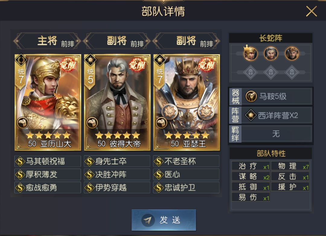 该阵容主打普攻反击与物理输出,队伍中亚历山大对物理伤害有较搞抵抗性,配合忠诚护卫的分担效果能保证他的承受的伤害显著降低,同时利用反击与彼得大帝形成良好的队伍输出,虽然整体爆发伤害不高,但坦度、续航和持续伤害都很优秀,非常克制以物理输出为主的菜刀队。