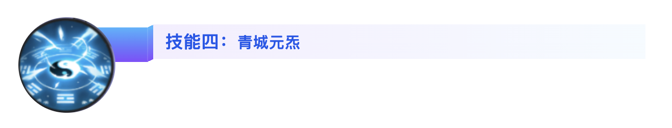 技能表现:凝结青城元炁冲击附近任意目标并施加持续5秒的“青城符”。冲击附近敌人造成70%攻击伤害;治疗友方相当于施法者70%攻击的生命值,若友方被完全治愈则获得“青城元炁”:伤害加成+20%,持续5秒。根据凝结时间可最多提升伤害和治疗倍率至240%。