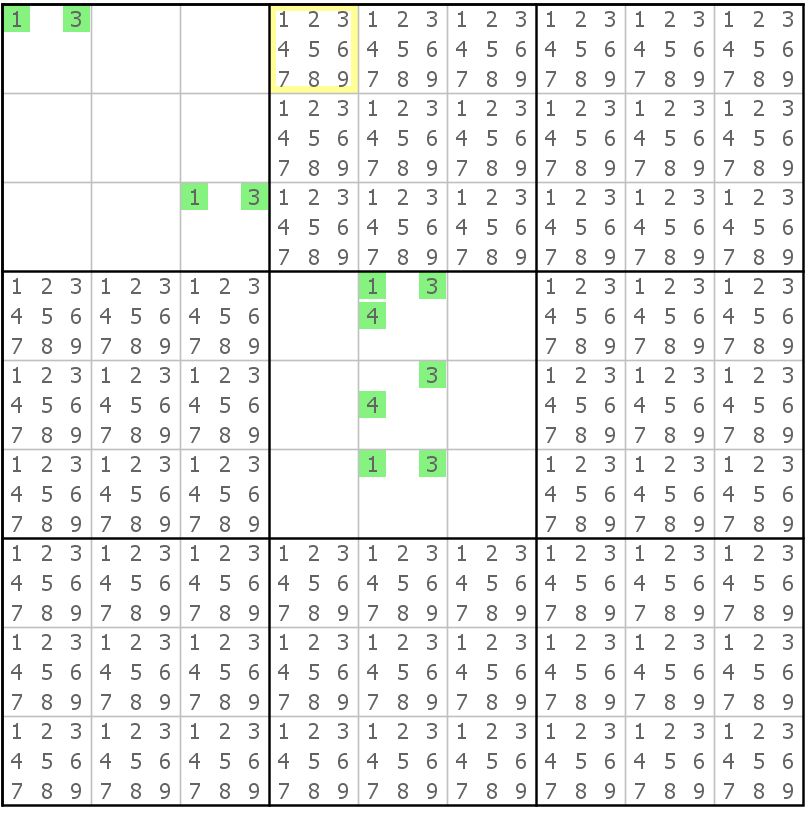 举个例子,能找到图中的一个双强链吗?最简单的结构,找两条强链,而且这两条链有一端在同一个单元(行,列,宫)里面(就是可以用弱链链接,这样就构成了强弱强结构)