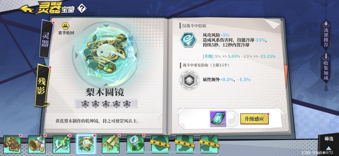 灵器 花间魅 不动明石 风蒲团 晚春藤 清净琉璃瓶 风蒲团可以配合残影梨木圆镜减cd (没风攻击可以捡一个攻击触发的残影)或者直接用印山兽减cd