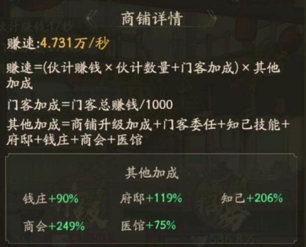 这里有个小技巧,将技能高的门客,派遣至最后解锁的那个商铺中,收益是最大的。