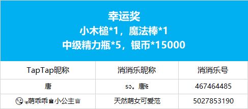 参与活动的有效评论每达到25个,随机抽选1位小村民获得:小木槌*1,魔法棒*1,中级精力瓶*5,银币*15000,并再随机抽选1位小村民送出:消消乐玩偶*1(款式随机)
