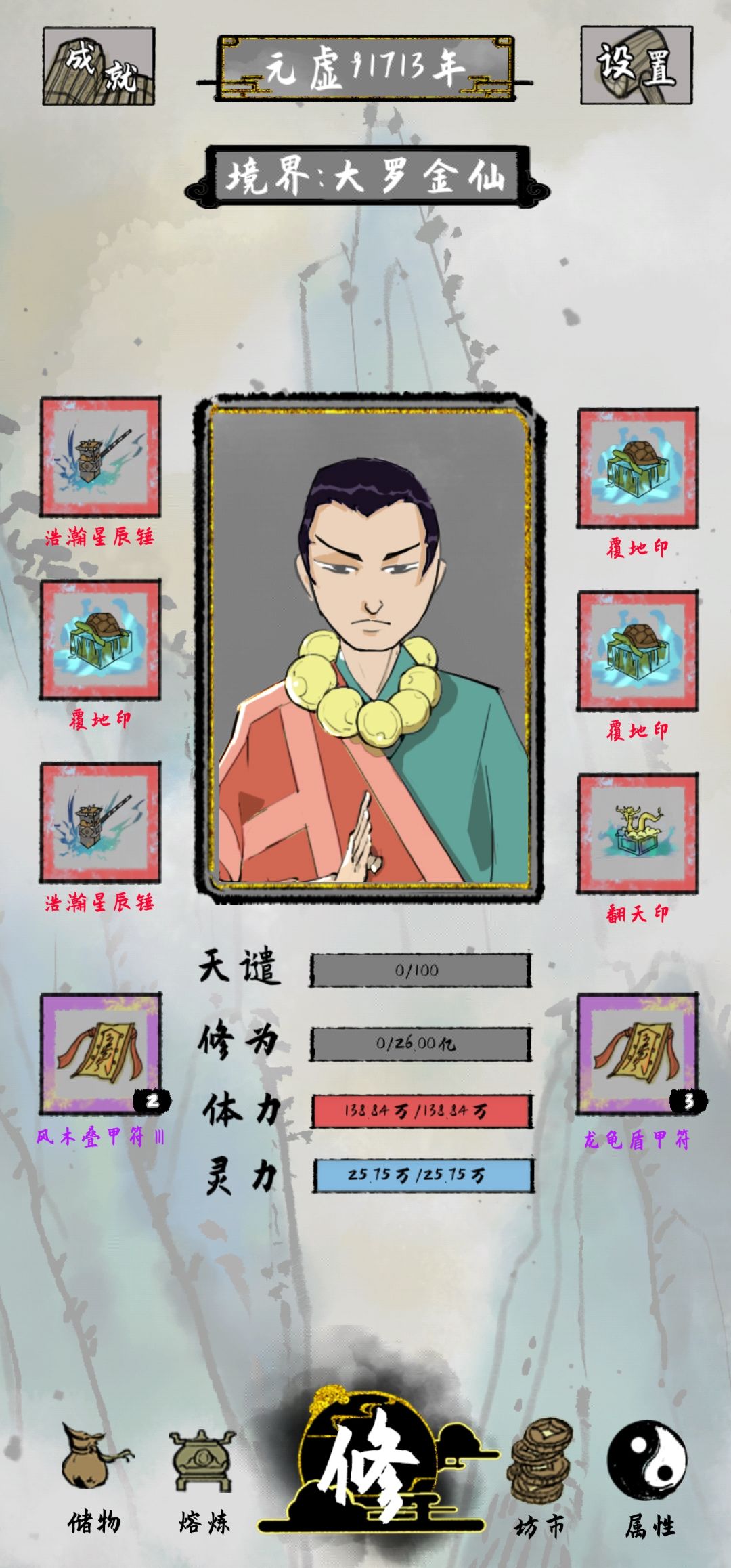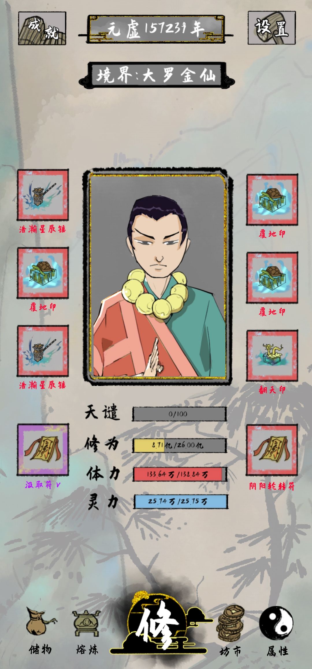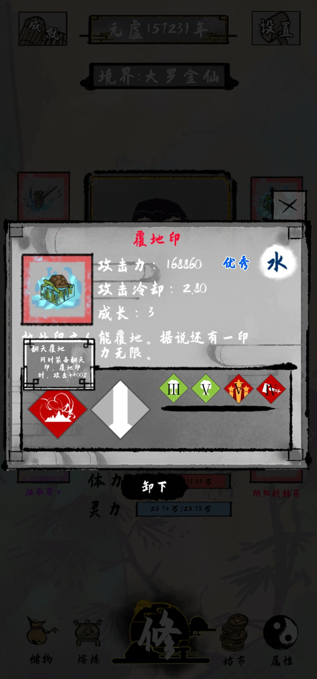 打了一晚上终于通关了 ,发现了两个 比较好的搭配 ,同时装备翻天印和覆地印会增加四倍攻击 ,加上会心简直无敌了