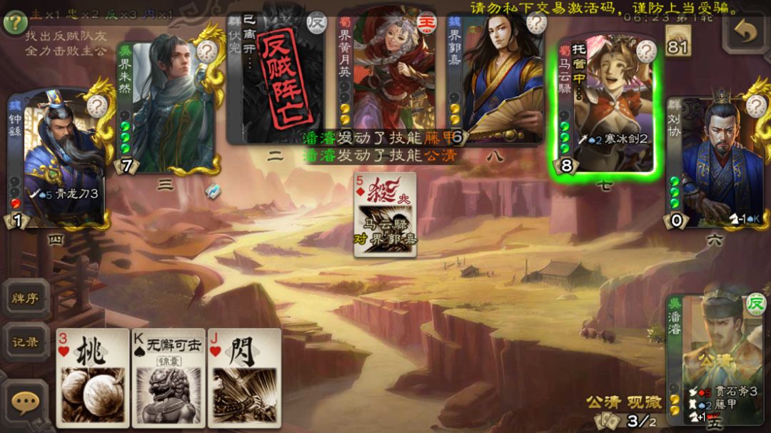 潘濬的强度来源于【观微】的强辅助,那么他回合外的手牌就是敌方需要处理的关键。没有牌的潘濬就是白板,所以从而对潘濬的手牌拆顺和体力集火(一个目的:回合外存不住牌)。最后自身发动技能都难,直接白板。