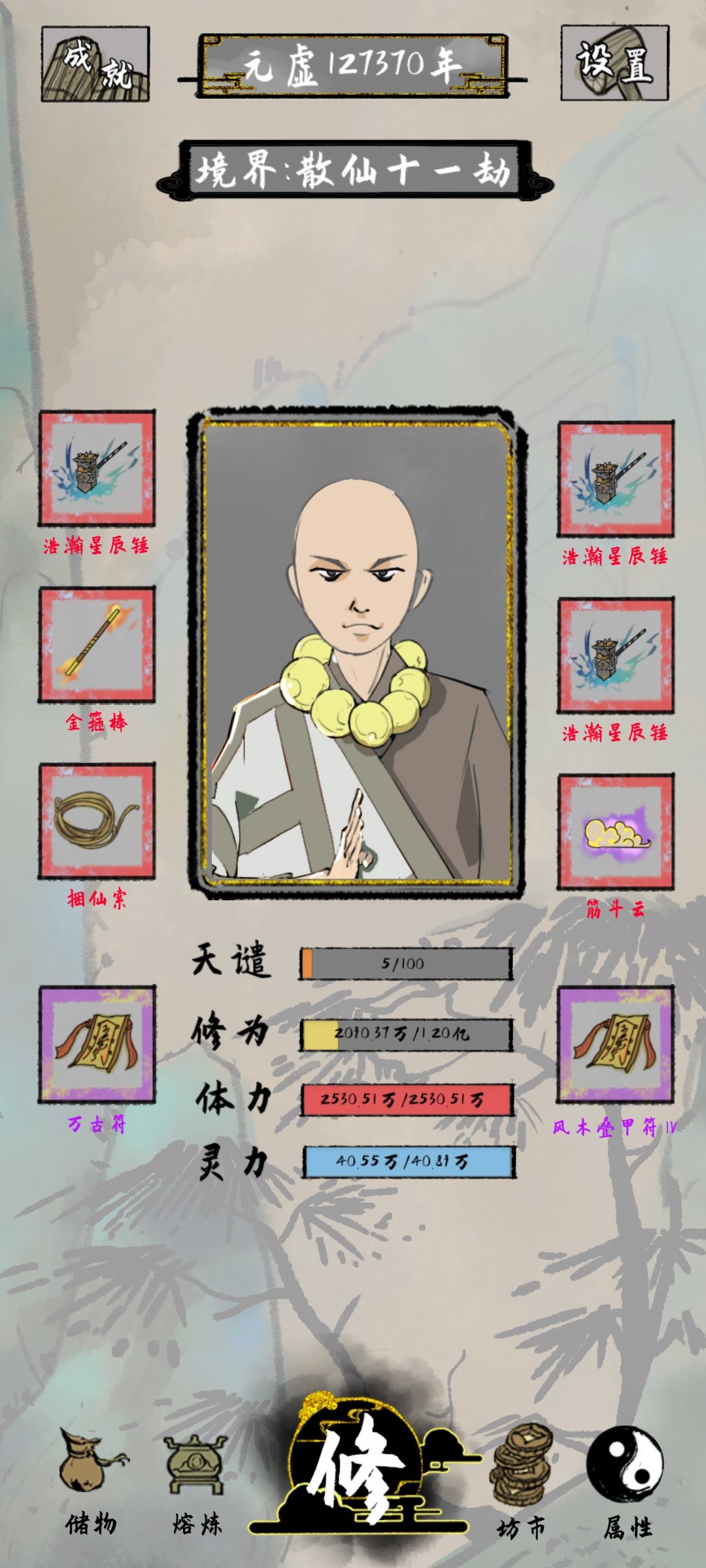 6、关于寿命不够,开局很重要。讲两个最重要的天赋:寿星、丹体。一方面可以用寿星天赋加,但这个游戏突破一次大境界会按照百分比增加寿命,所以要在炼气期尽可能多加寿命。不过我更建议先开一个号收集寿元丹,然后在继承的时候,炼气期全部吃掉。就比如我这个号九窍金丹✘4,舍利子一个加100,涅槃一个加一百,再加上我的丹体天赋+25%炼气期从80就涨到了400多的寿命,一突破直接934的寿元上限,后期随便刷,笑死根本老不死