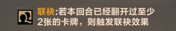 带有联袂(mei)的卡牌通常会附带一些特殊效果,这些效果在联袂的限制下,只有在本回合翻开过2张(包括本身)卡牌之后,才能生效。需要注意的是,它是按照场上结算顺序触发的。虽然在你放下一张卡牌后它会亮起示意,但是实际上场后一定要在其他卡牌后面结算才可以真正触发。