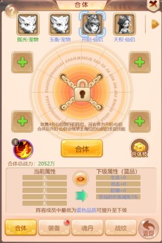 已激活的合体可通过使用太虚试炼获得的地魂精魄提升魂丹等阶;魂丹共设有6种魂丹,当前魂丹等阶达到50阶后即可开启下一种魂丹,魂丹分别为:天魂,地魂、人魂、魂、阴魂、阳魂