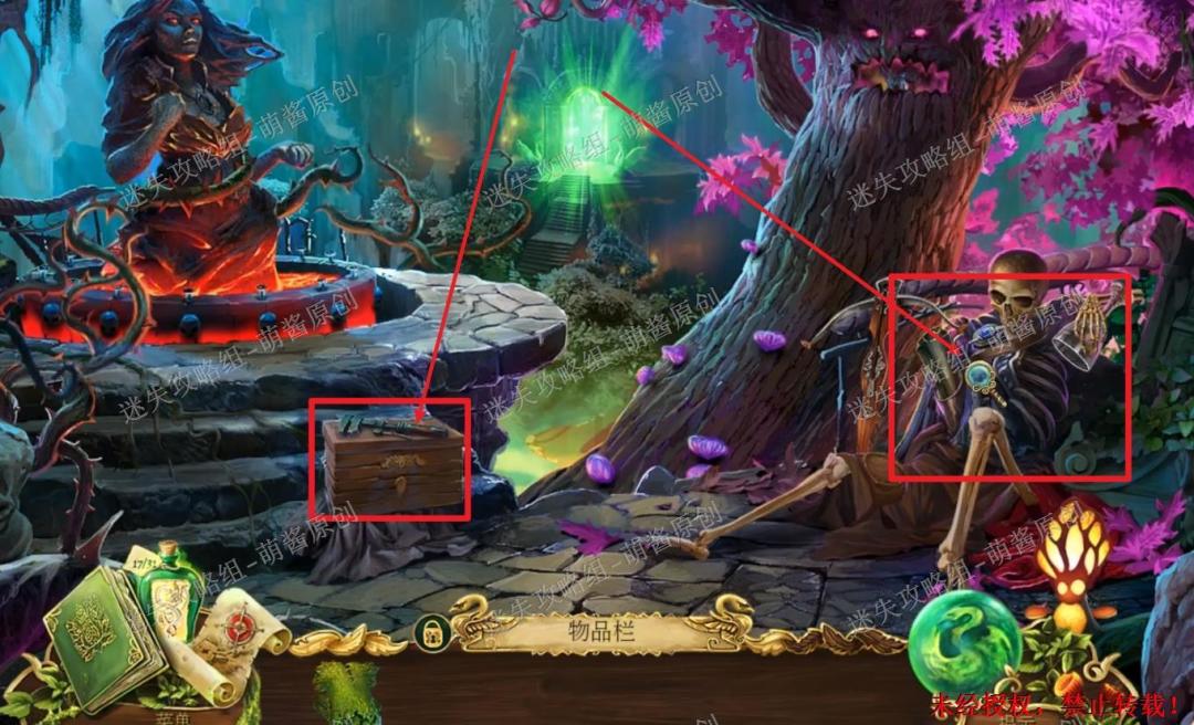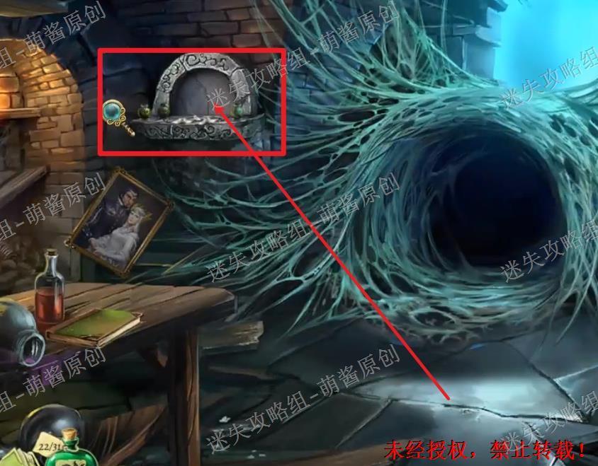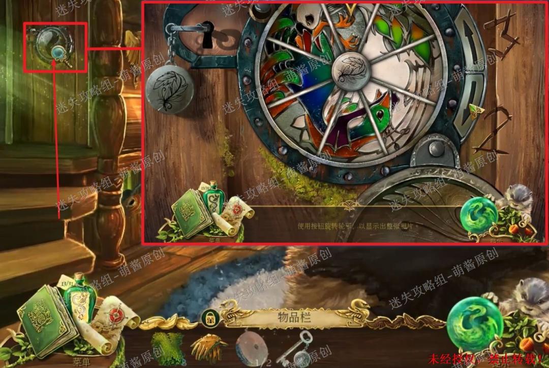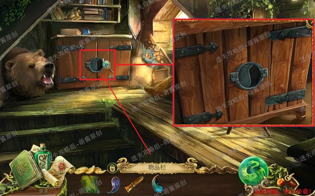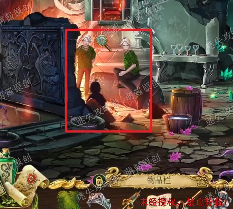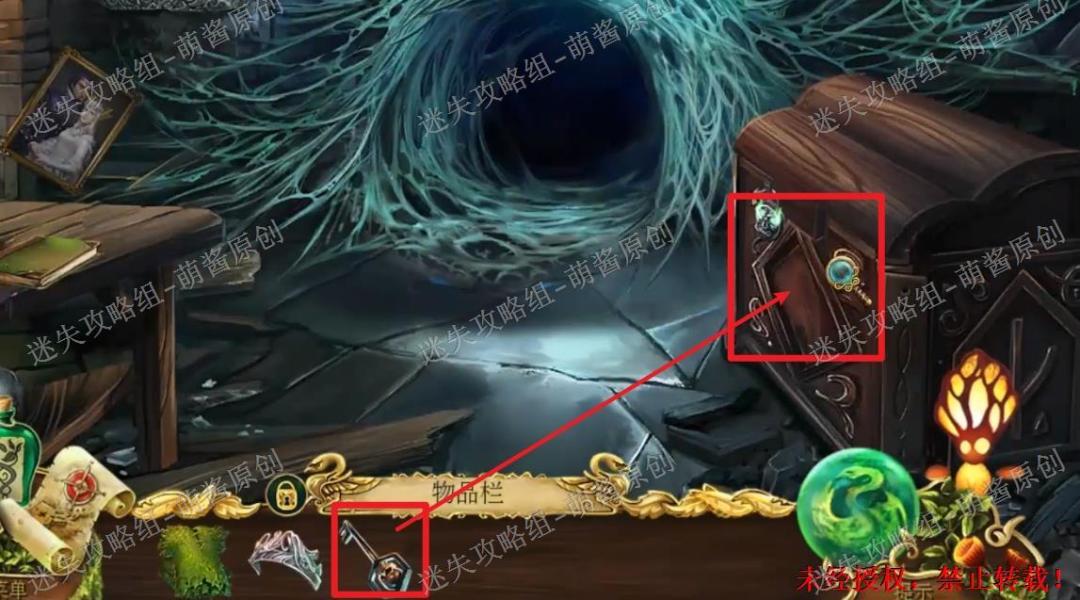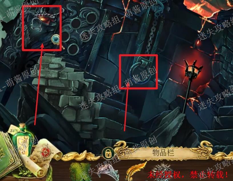 12、开启小游戏:点击图中红框处放大场景,将两把钥匙置其中,开启小游戏。完成小游戏,点击拿走里面的“邪恶显灵护符”。12X1