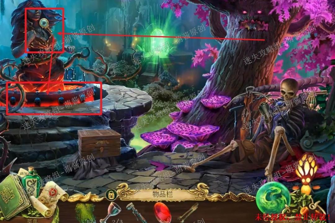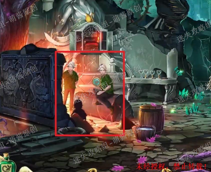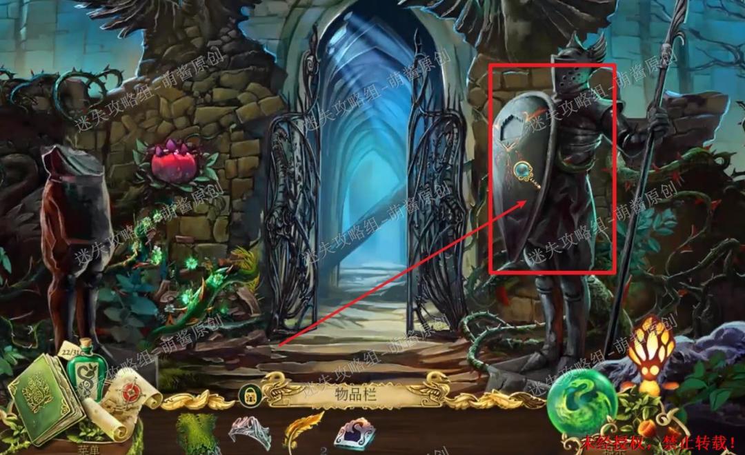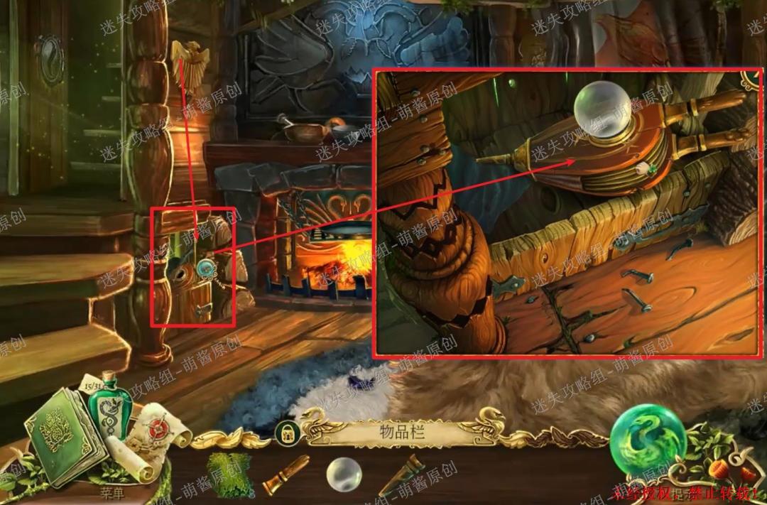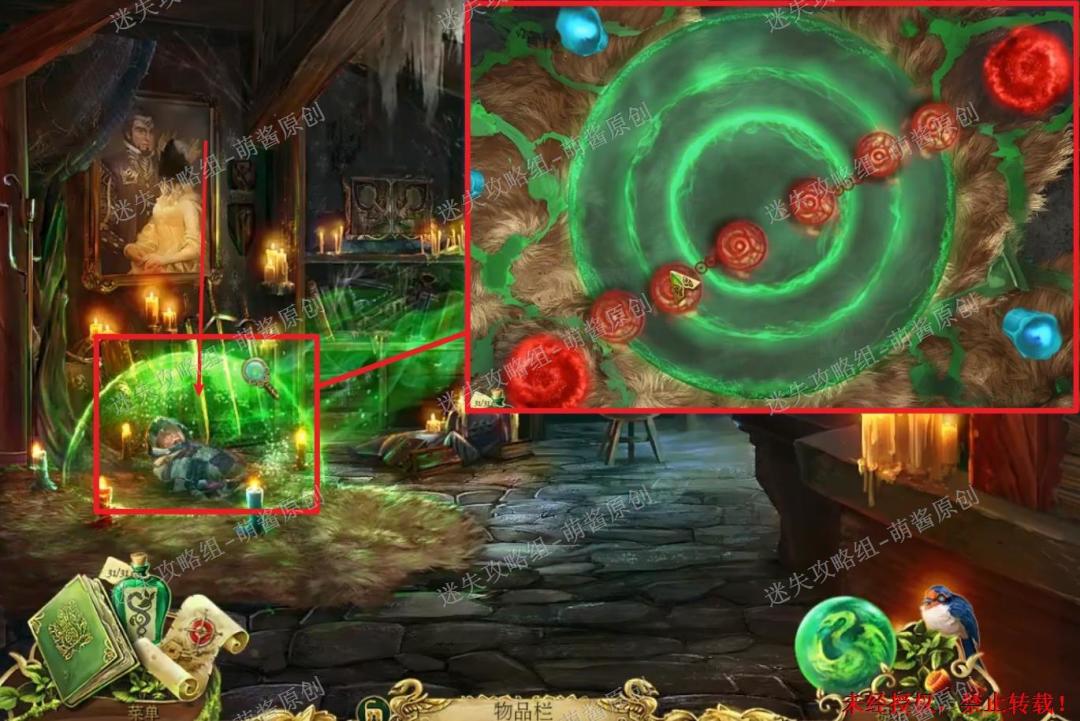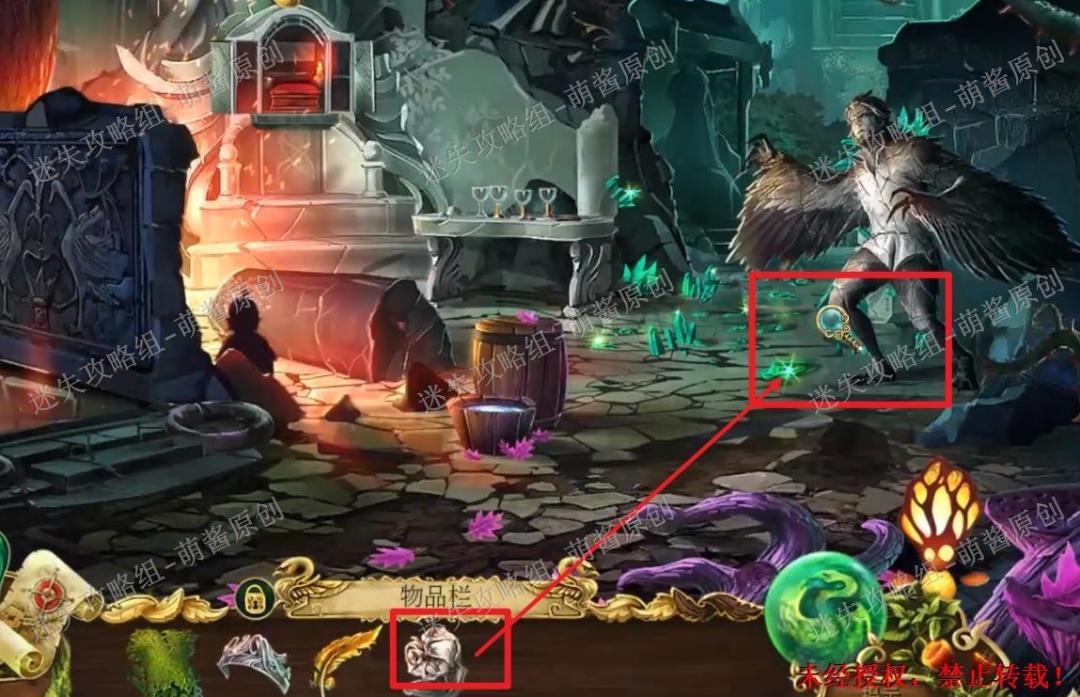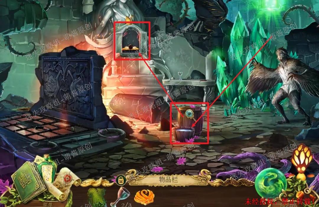 12、开启小游戏:点击图中红框处放大场景,将两把钥匙置其中,开启小游戏。完成小游戏,点击拿走里面的“邪恶显灵护符”。12X1
