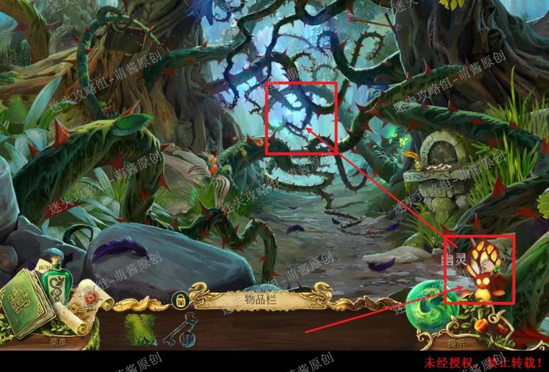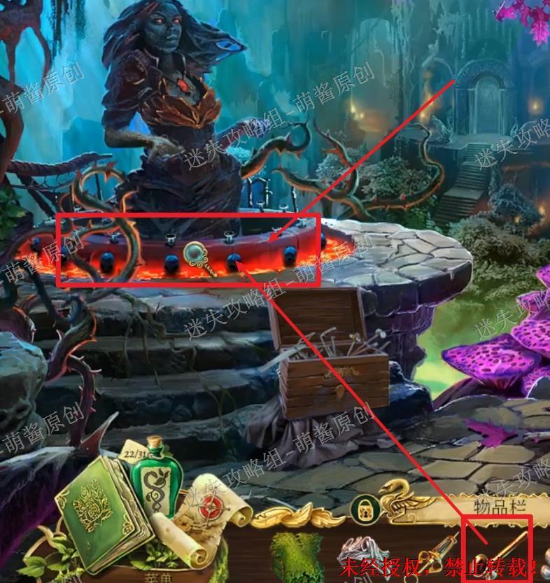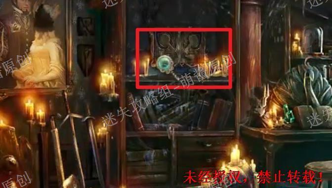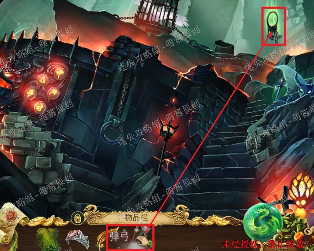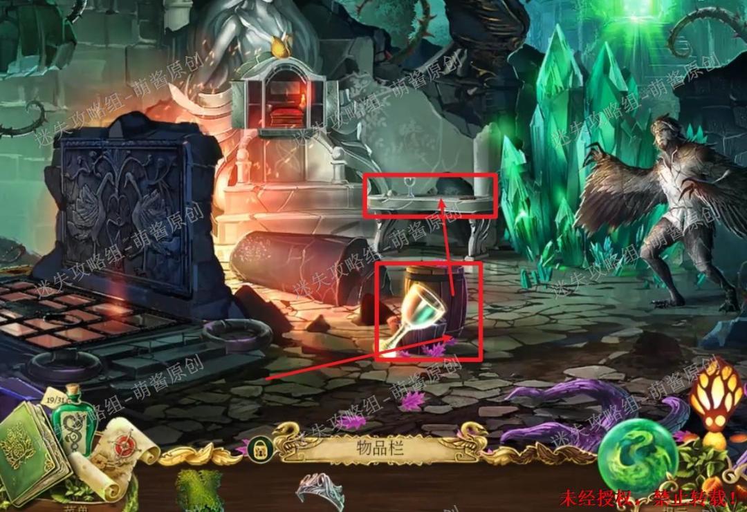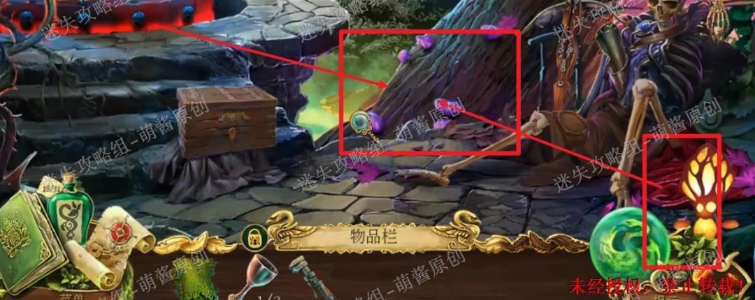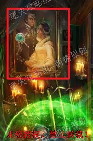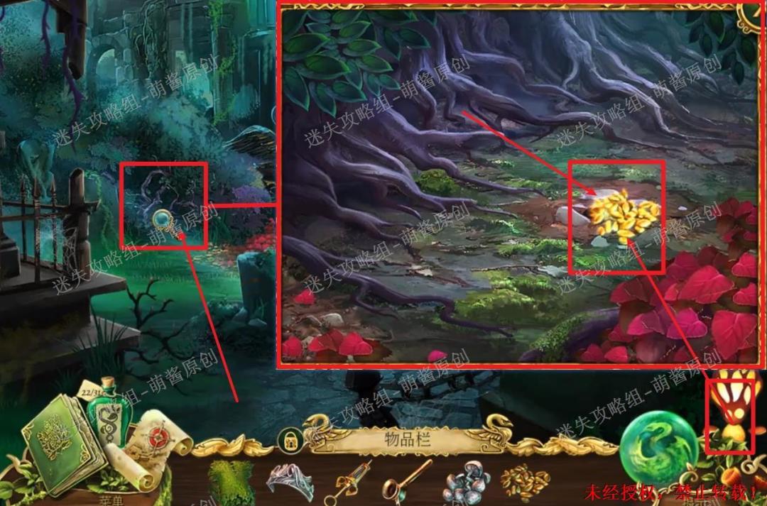 12、开启小游戏:点击图中红框处放大场景,将两把钥匙置其中,开启小游戏。完成小游戏,点击拿走里面的“邪恶显灵护符”。12X1