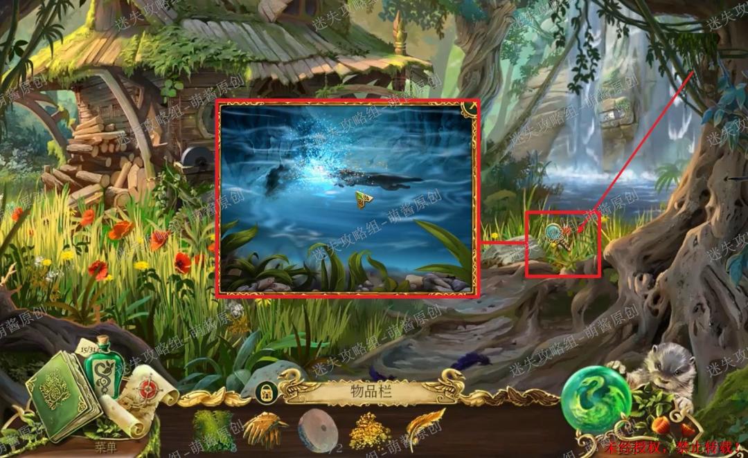 17、获得“红鲱鱼”:回到房子外,点击图中红框处放大场景,接着先将“诱饵”放进水里,旁边的红鲱鱼会游过来,这时选择伙伴水獭点击金鱼,获得“红鲱鱼”。17X1