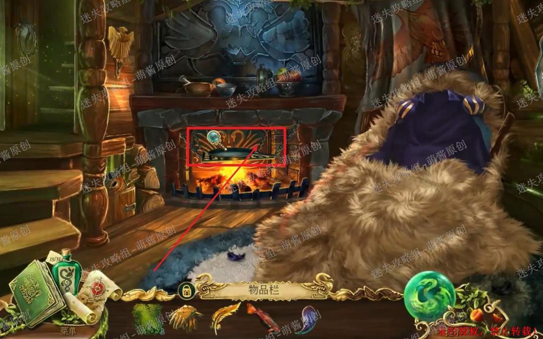 21、获得煎鱼:回到林间小屋内,点击图中红框内的烤架放大场景,将“红鲱鱼”放在烤架上,获得“煎鱼”。21X1