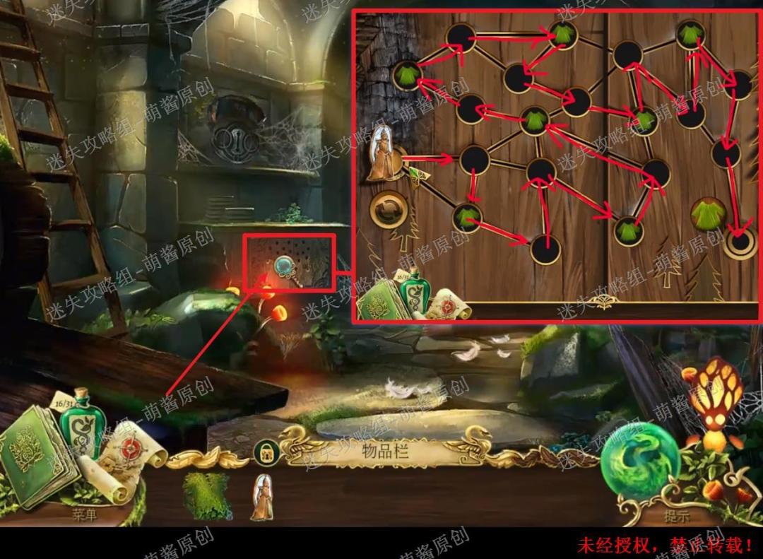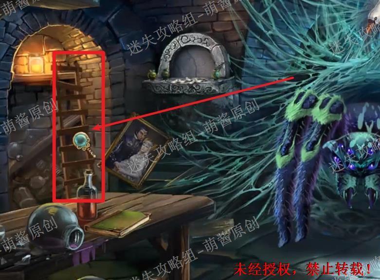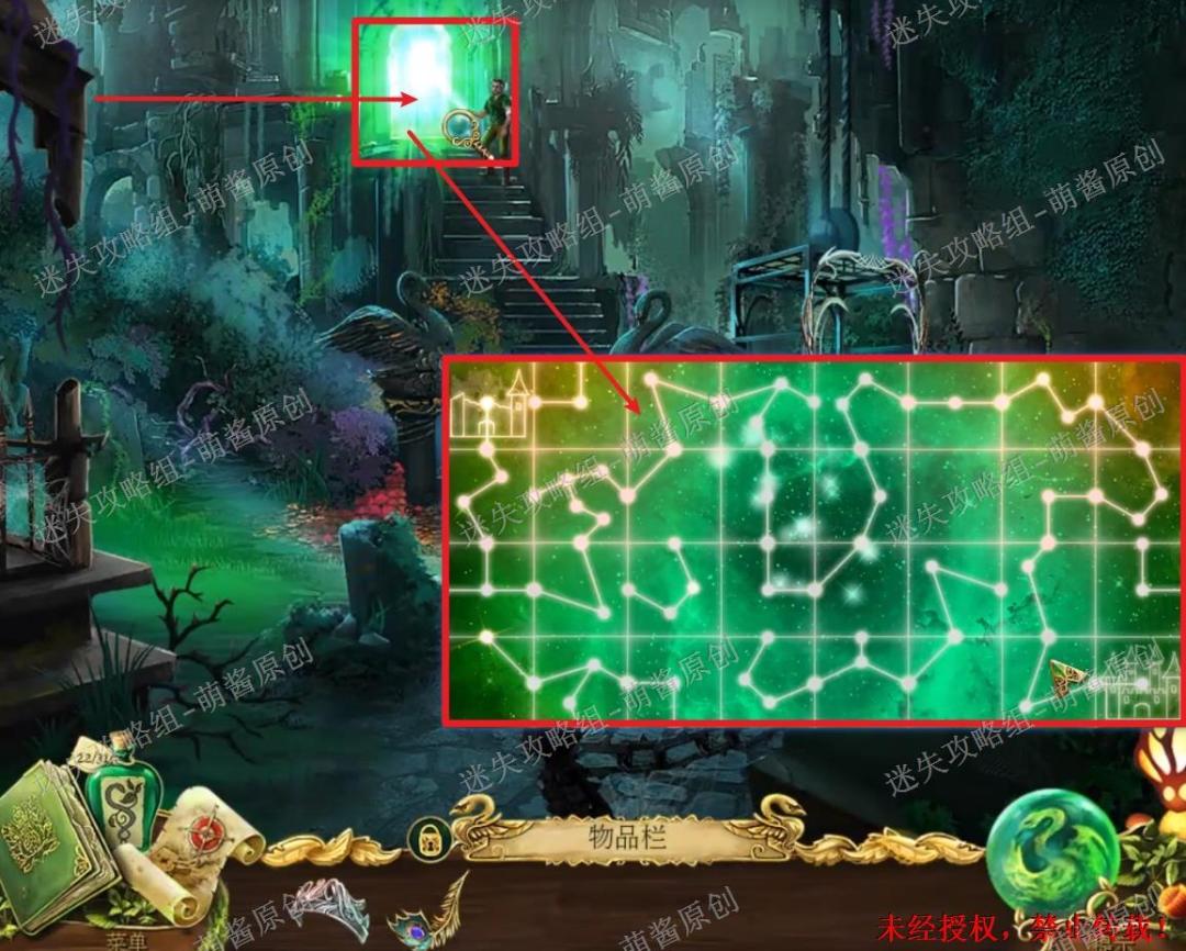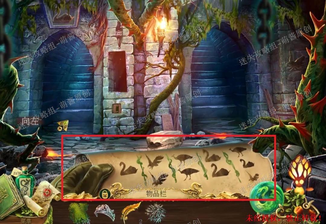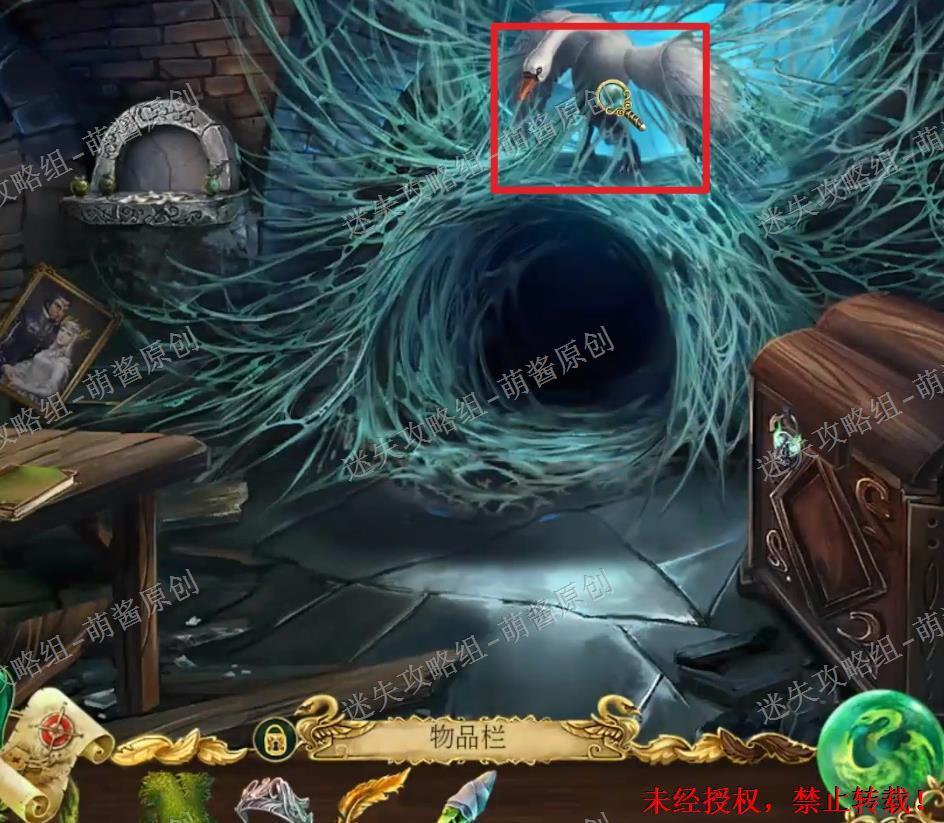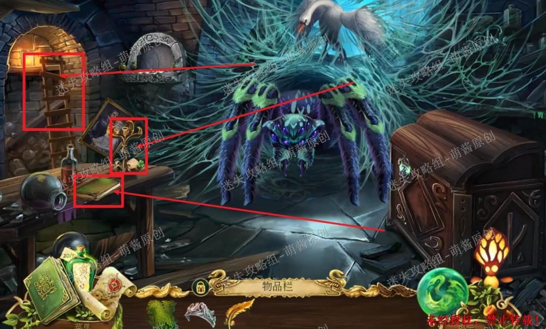 22、获得蜘蛛丝、地牢地图、黄金羽毛:回到天文台场景,点击白天鹅放大场景,然后选择“碎片”点击拿走白天鹅身上的蜘蛛丝,再选择“荨麻衫”点击白天鹅,这时白天鹅会变成人,点击拿走他手里的地牢地图和旁边的“黄金羽毛”。22X1