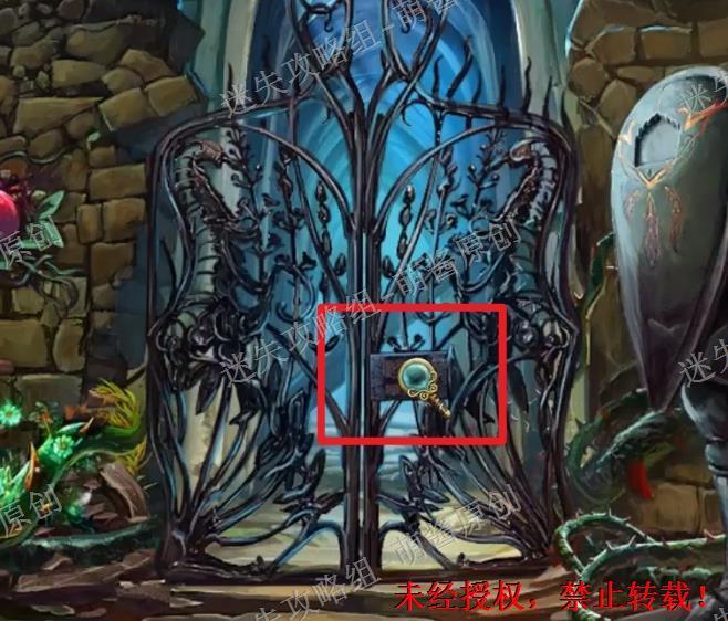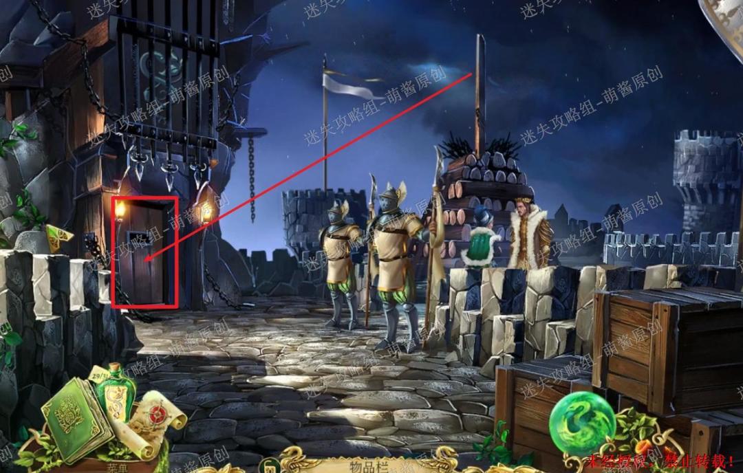 1、完成找物·获得门锁:来到城堡大门这一场景之后先点击此处进入找物环节,如图完成找物,获得“门锁”。1X1