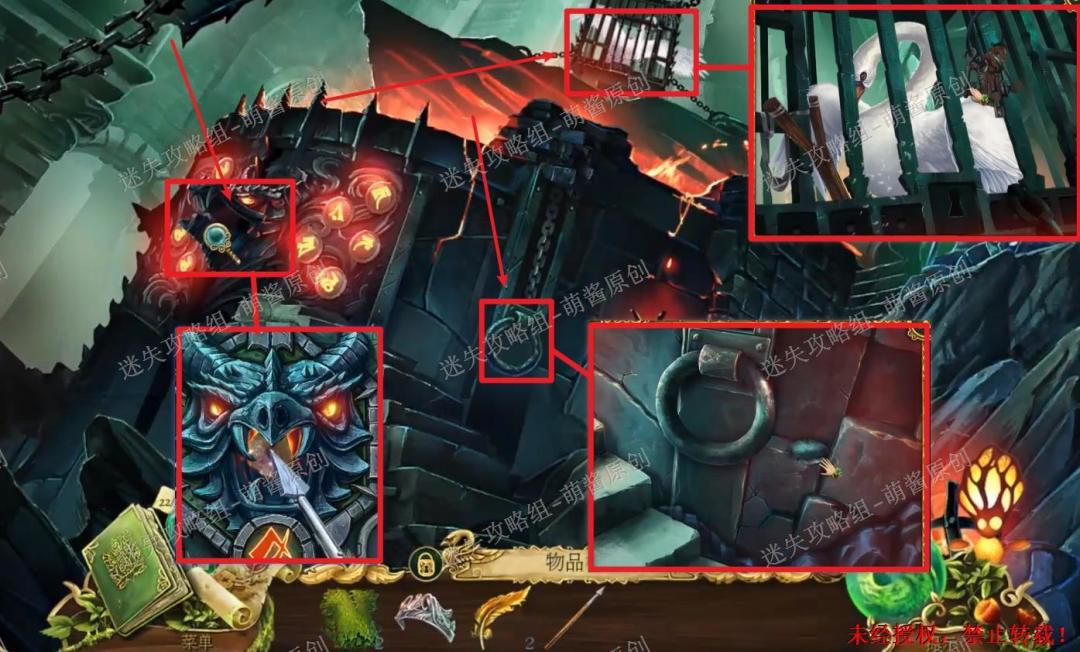 29、获得弹弓:回到地牢,先点击左边的龙首雕像,用长矛将龙嘴里的东西击碎。然后点击右边的圆环放大场景,点击拿走圆环旁边的石头。最后点击上方的天鹅笼放大场景,点击钥匙,钥匙会飞走,再点击拿走弹弓。29X1