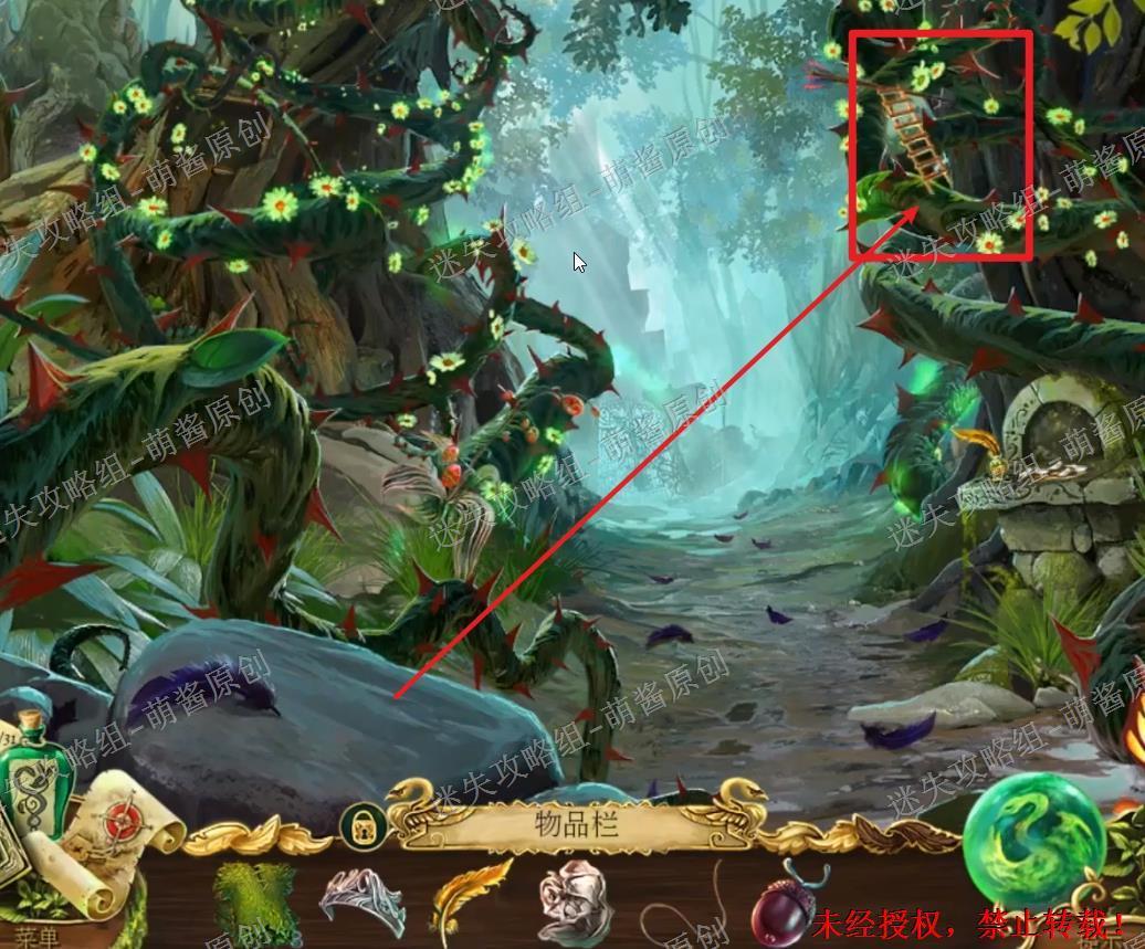 16、获得十字弓矢:回到森林场景,点击图中红框区域放大场景,再选择“梯子”将其放入其中,点击拿到树上插着的“十字弓矢”。16X1