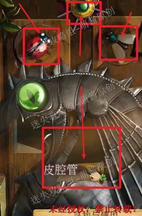 31、完成找物小游戏·三:获得皮腔管:将“苍蝇”、“瓢虫”、“盾徽”置入图中标注的缺口中,中间龙雕塑的暗格打开,点击获得“皮腔管”。31X1