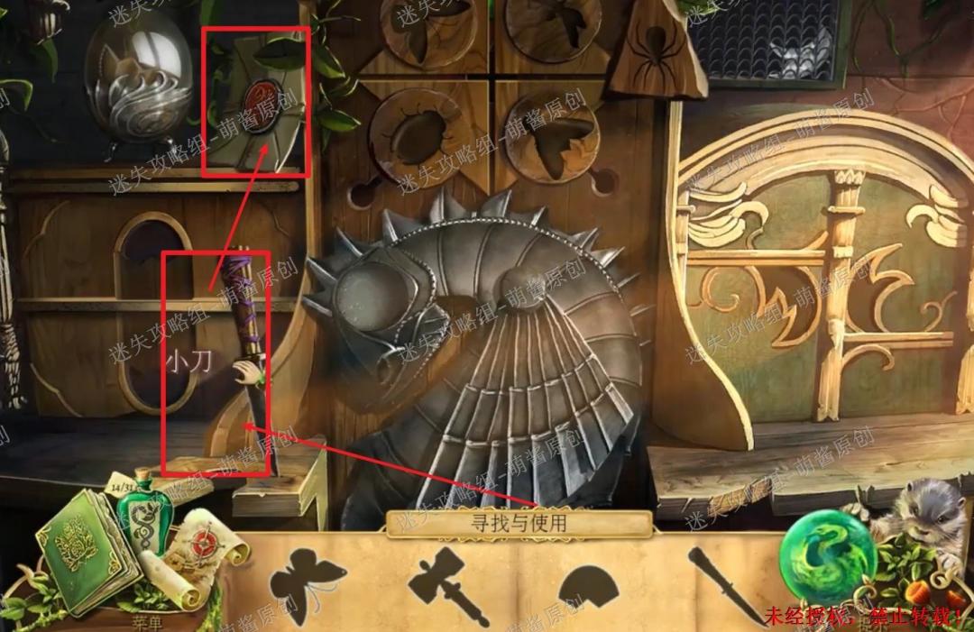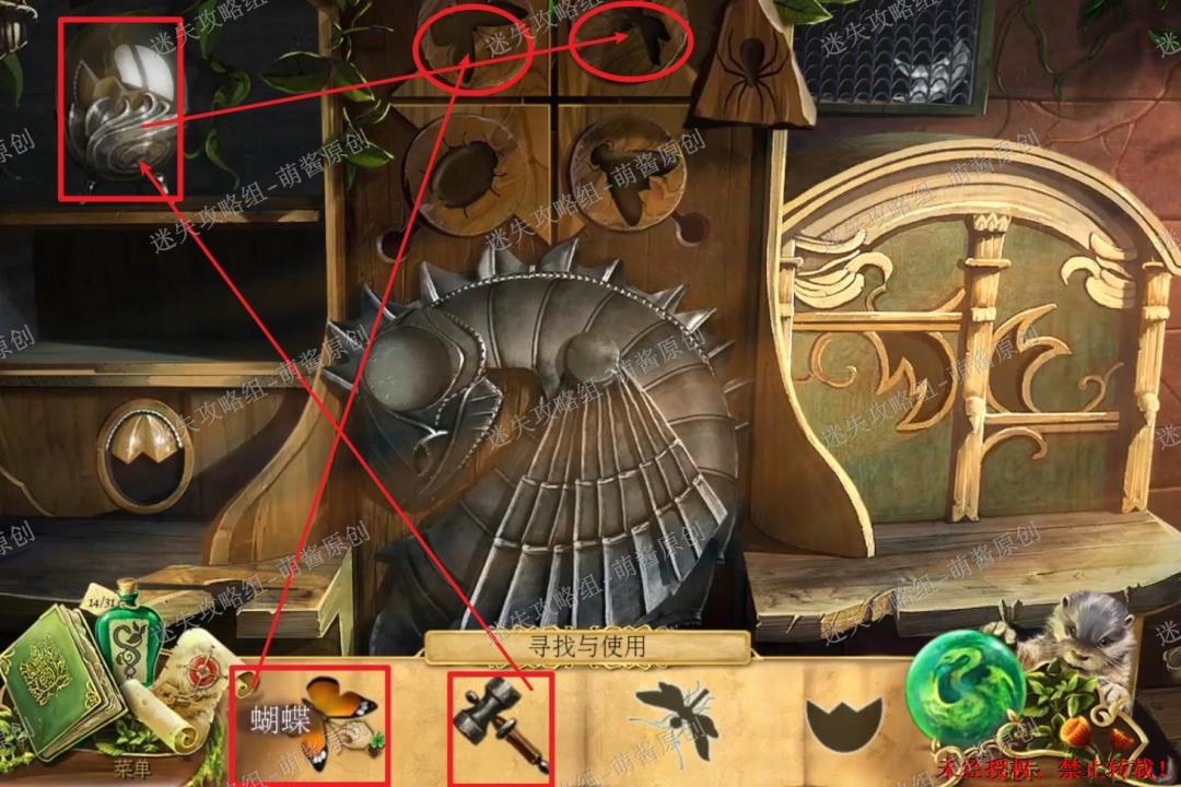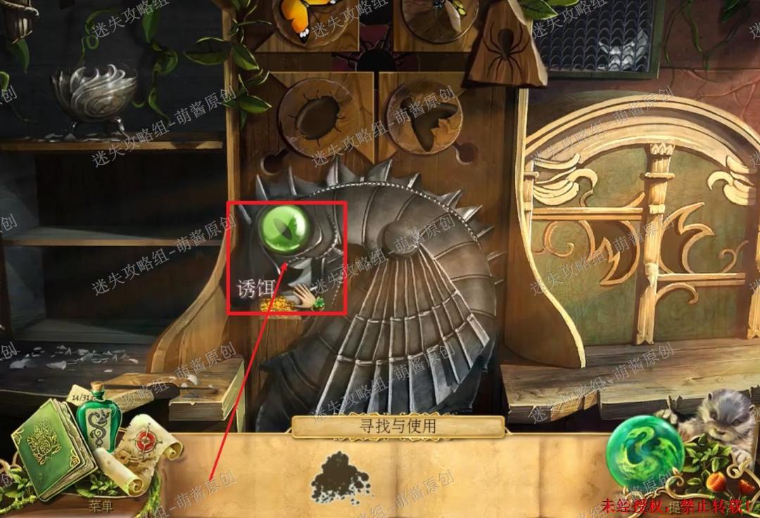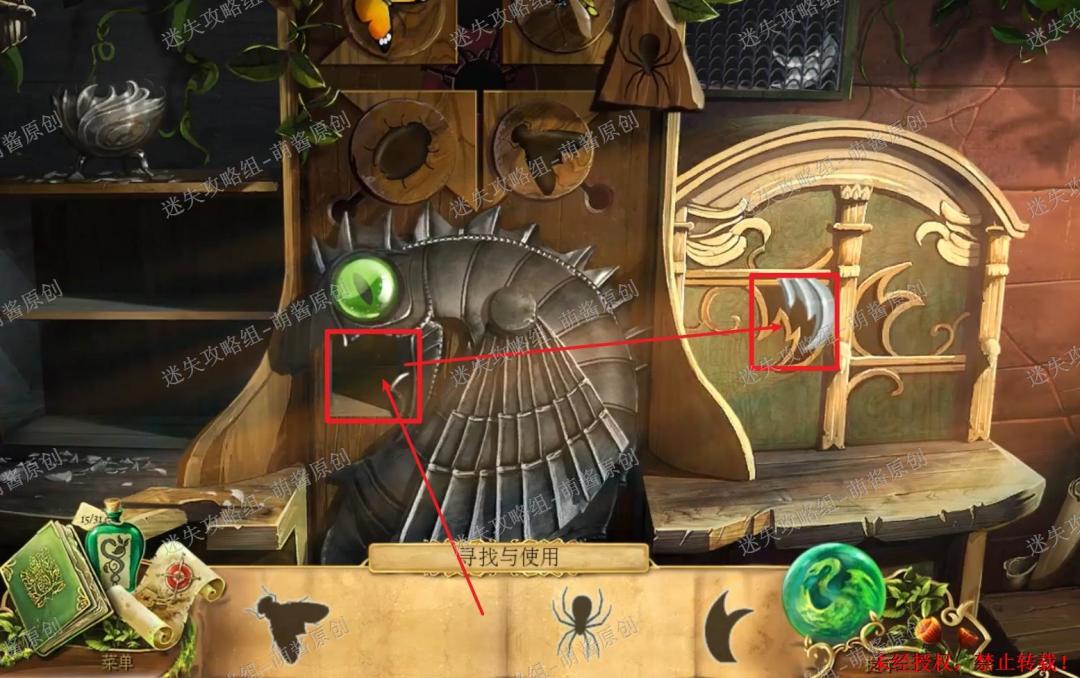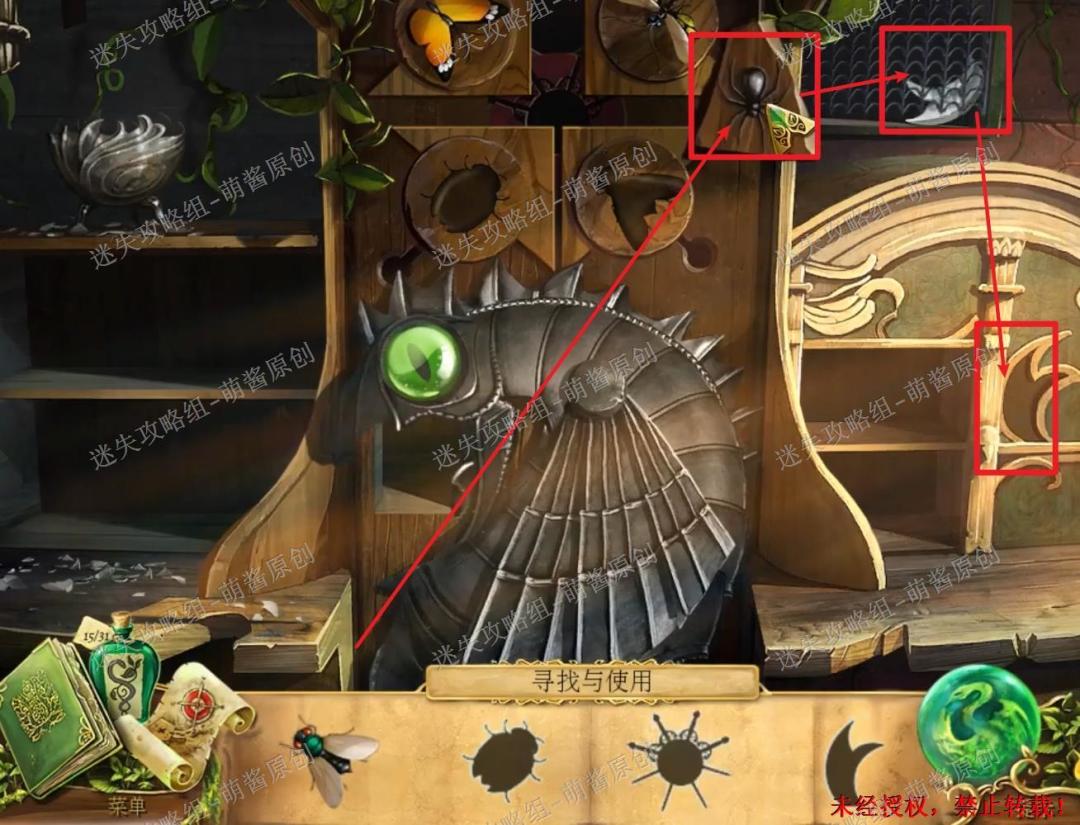 30、完成找物小游戏·二:然后将“蜘蛛”置入右上机关的缺口内,机关打开,点击获得“羽毛符印”。然后将“羽毛符印”置入右下方的机关中,右下方的柜门随之打开,点击拿走“瓢虫”和“盾徽”。30X1