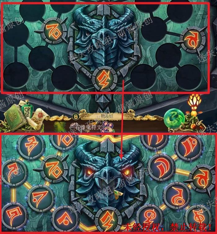 27、接着点击左边的龙首雕像放大场景,将“石像鬼符文”置入雕像里,开始小游戏。如图完成小游戏,龙翔的嘴巴会张开,点击拿走“骑士王冠”。27X1