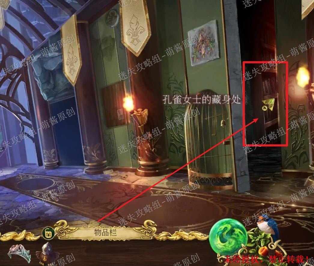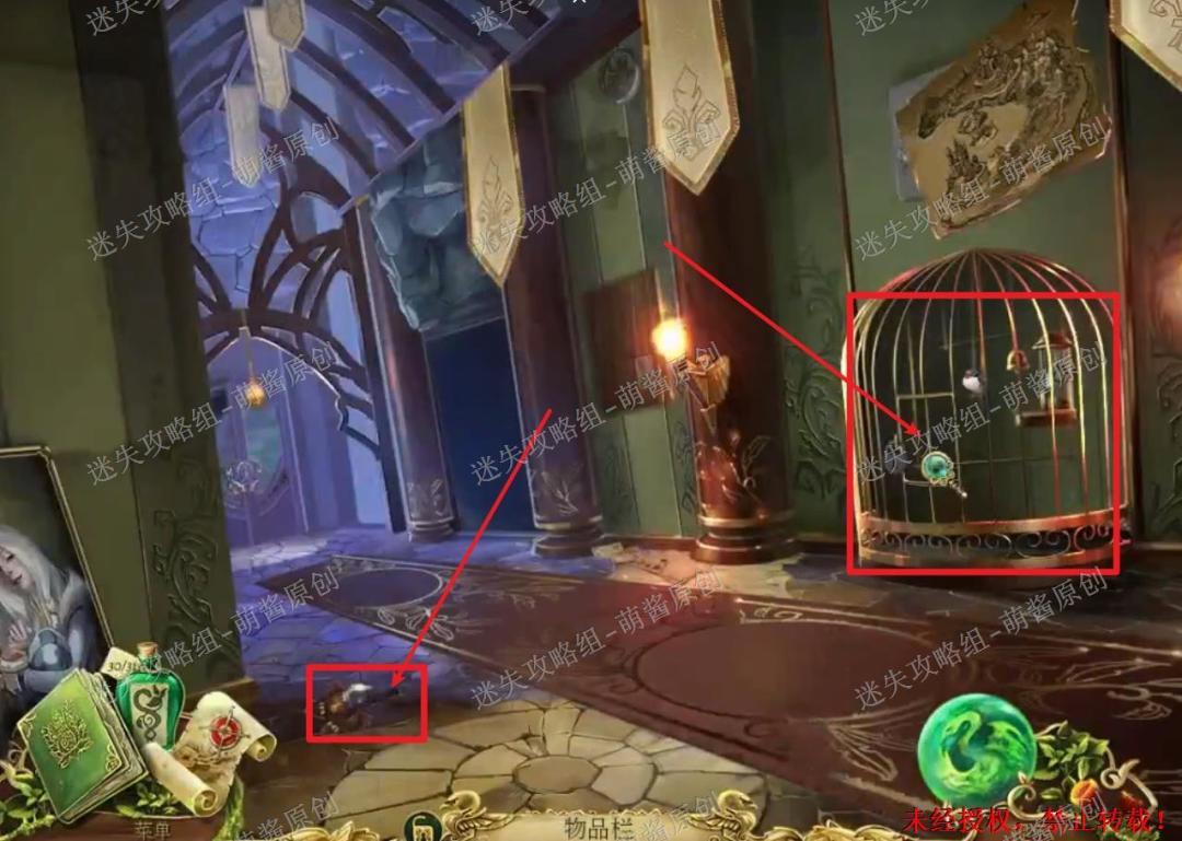 3、获得同伴·燕子:回到上一场景之中,先点击图中左边红框处,获得“丝绒鹰”。再点击右下角的鸟笼,选择“纺锤”点击锁孔打开鸟笼,燕子会重新加入我们的队伍。3X1