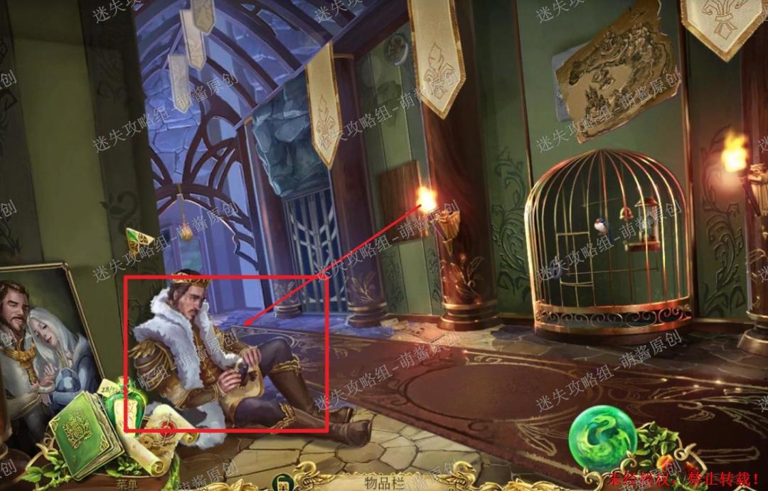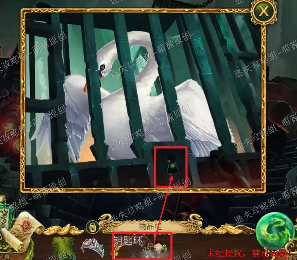 32、获得金色羽毛:点击上方的天鹅笼,选择“钥匙环”点击锁孔将笼子打开,然后选择“荨麻衫”点击白天鹅,然后白天鹅会变回人,点击拿走他手里的“金色羽毛”。32X1