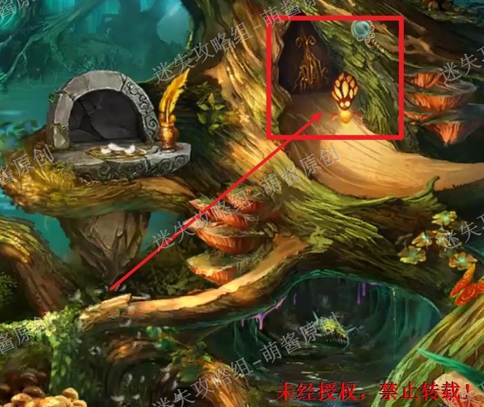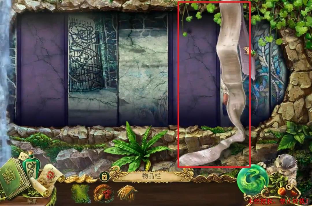 27、获得孔雀符印:点击图中红框石台处放大场景,将“金色羽毛”放进石台上面的壶里,触发剧情。剧情结束以后点击石台上的小石门,拿走里面的“孔雀符印”。27X1