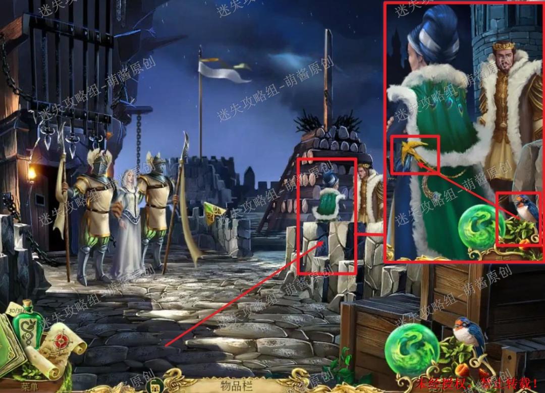 28、获得长矛:回到城堡大门,点击门口的骑士放大场景,将“骑士王冠”置入盾牌上的缺口内,然后点击拿走士兵手上的“长矛”。28X1