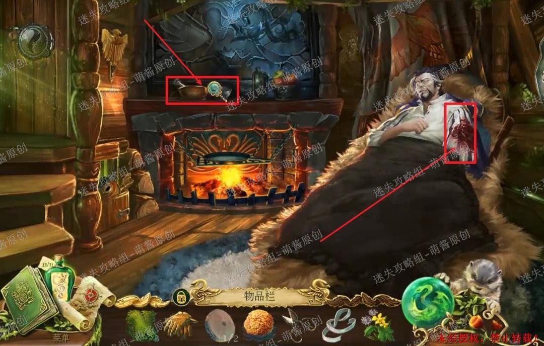 9、获得“书房钥匙”:回到房内,点击左边的红框处放大场景,将“治疗药草”放进碗里,再点击旁边的工具将“治疗药草”捣碎。然后点击右边红框处放大场景,先选择“锋利的剪刀”将伤者的袖子剪开,然后点击袖子将其扯下,再用海绵先进行清洁,然后药草放在伤口上,最后用绷带点击他的胳膊,完成治疗,获得“书房钥匙”。9X1