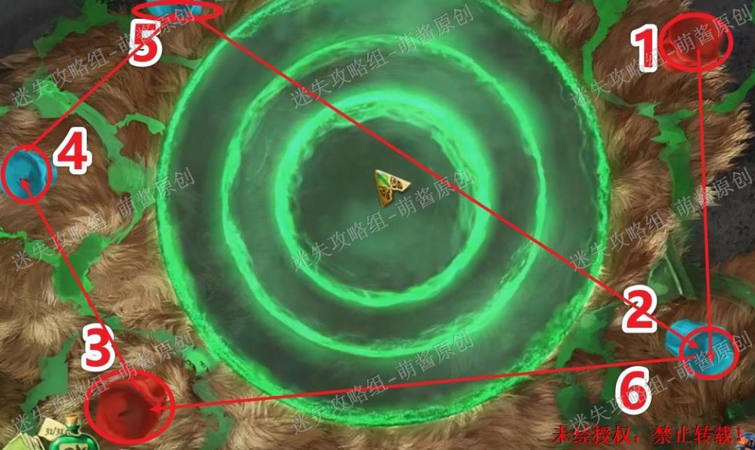 42、获得反魔法药剂:回到天文台,点击右下角的宝箱放大场景,将“熔岩”、“空气花”、“魔法药草”、“灰蘑菇”、“茴香”和“魔法汁液”依次放进碗中,然后按照图中的顺序依次点击,完成之后点击左上方的瓶子,获得“反魔法药剂”。42X1