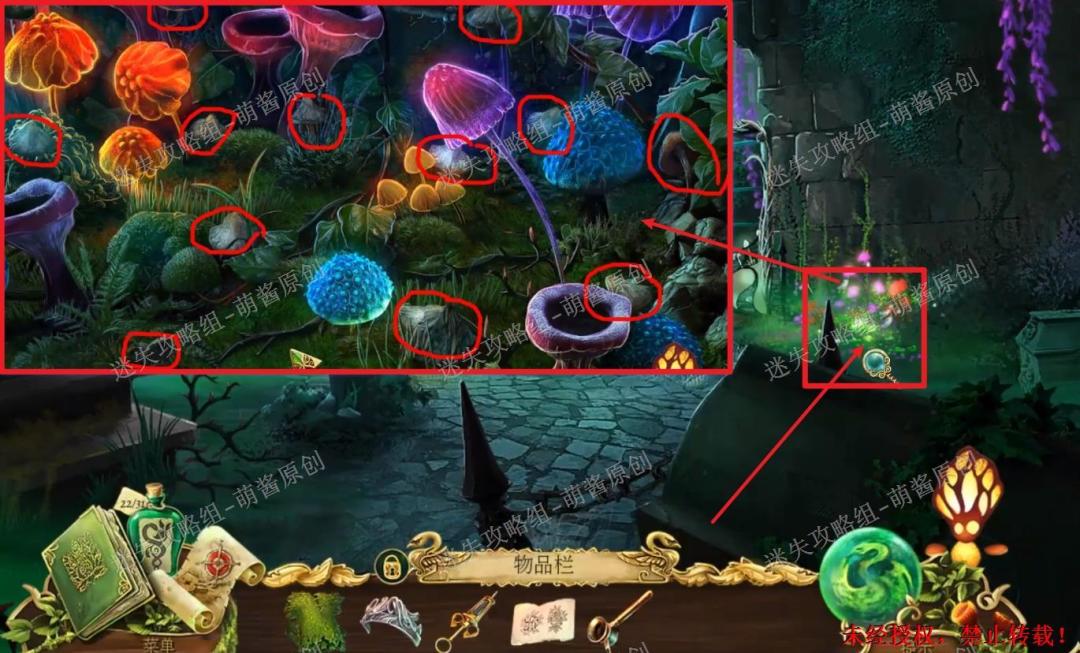 35、获得灰蘑菇:回到墓地,点击图中右边红框标注的地方进入找物环节,如图完成找物获得“灰蘑菇”。35X1