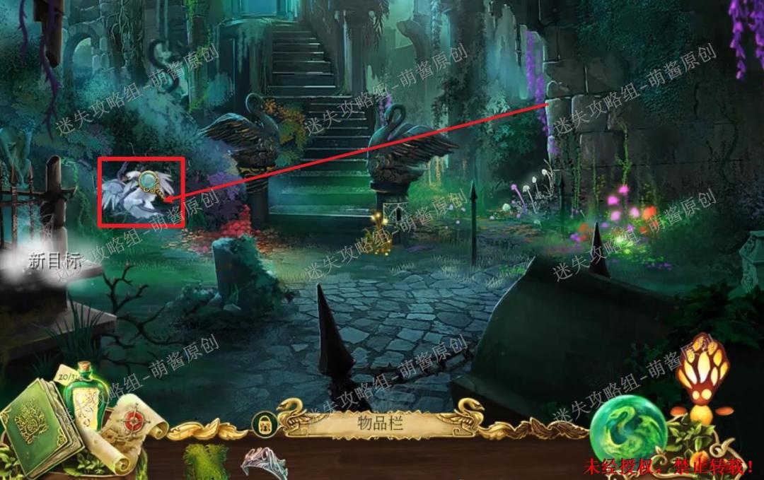 10、获得金色羽毛和升降机拉杆:来到墓地之后首先触发了一段剧情,剧情结束以后先点击白色的天鹅放大场景,将白天鹅身上的纸条点击掉,然后选择背包里的“荨麻衫”点击天鹅,然后天鹅会恢复成人形,点击拿走他怀里的“金色羽毛”和“升降机拉杆”。10X1
