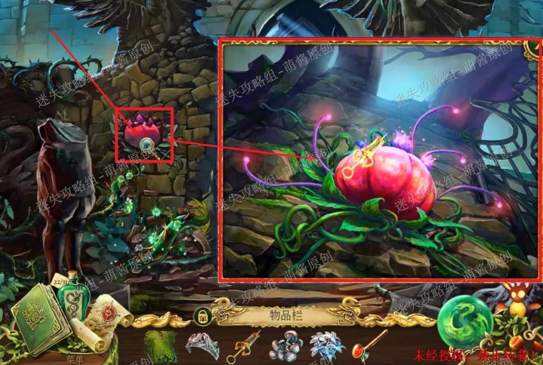 39、获得魔法汁液:回到城堡大门场景,点击图中左边红框标注的位置放大场景,然后选择注射器,点击大果子,获得“魔法汁液”。39X1