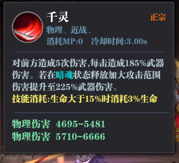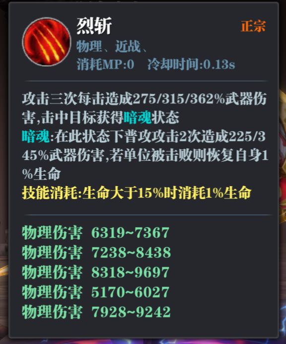 释放过后有3S左右的暗魂BUFF状态 之后释放任何技能(除了烈斩)都有伤害加成