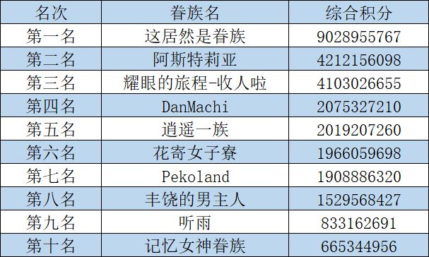 活动的眷族排名已正式公布,各眷族的具体排名及分数请各位冒险者前往游戏内查看。