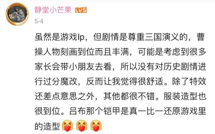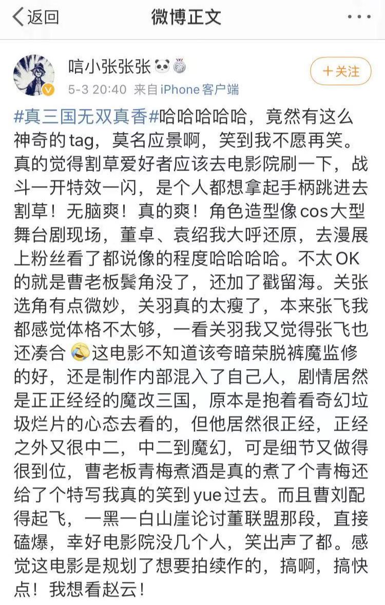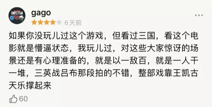豆瓣的gago表示,没玩过游戏的人看了只会觉得它不知所云,只有玩过游戏的人才能懂得它做出了什么样的还原。而且不止他一人这样觉得,霸哥连续刷了好几条都是如此评价,看来绝大多数普通观众都无法理解为什么熟知的三国会突然魔幻起来。不过如果能再次遇到提出这种疑问的人,热情的霸哥一定会掏出手机,把游戏安利给他的,让他感受一把真三手游里一骑当千、无双割草的快乐的~