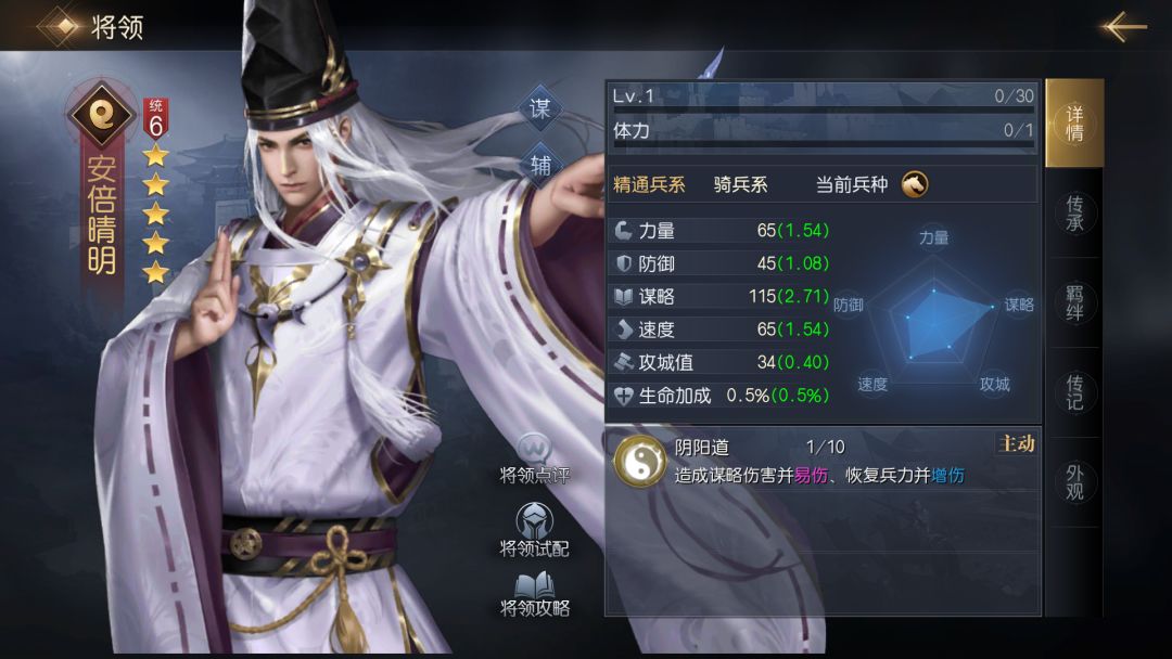 安倍晴明是另一种状态队伍的关键人物,可利用易伤、增伤两种状态触发伤害或恢复,即可担任辅助也可用于输出,与卡包中的黑田官兵卫配合度较高。即使不组状态队伍,安倍晴明也可兼容到大多数队伍中担任辅助位。