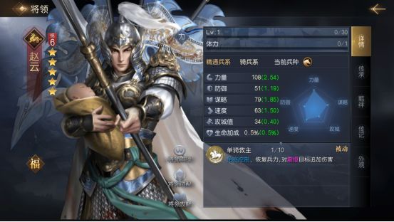 赵云的各项属性都非常优秀,他也是少有的利用力量值计算恢复率的辅助角色,因为技能的特殊设定,让赵云在造成伤害时可为主将恢复兵力,能兼容到大多数阵容中担任辅助与副输出,最佳副将名副其实。
