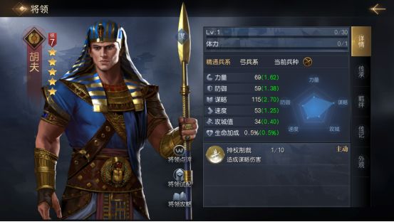 图坦卡蒙的是游戏中施加持续三大负面效率最高的将领,他每次发动技能都有几率对2名敌人施加这三种负面状态,并对已拥有负面的敌人触发即时伤害,几乎所有主打状态联动的队伍都可与其配合,和卡包中的胡夫配合度极高。