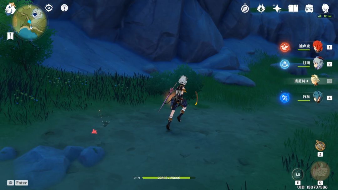测试实例:我这边是先把班尼特(腐殖之剑)大招开了,然后平A了一个火斧丘丘人将近2分钟,血量保持在75%以上,保证怪物未因血量削减掉落元素微粒。最终班尼特的大招充能如下图,也是验证了平A能产生元素能量。