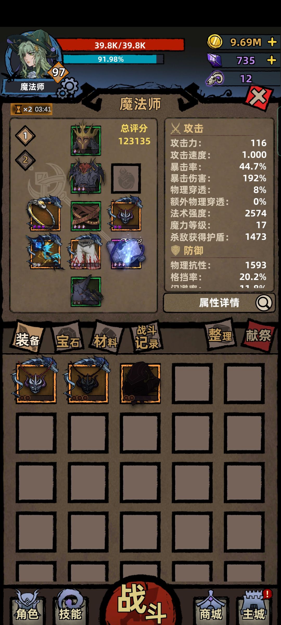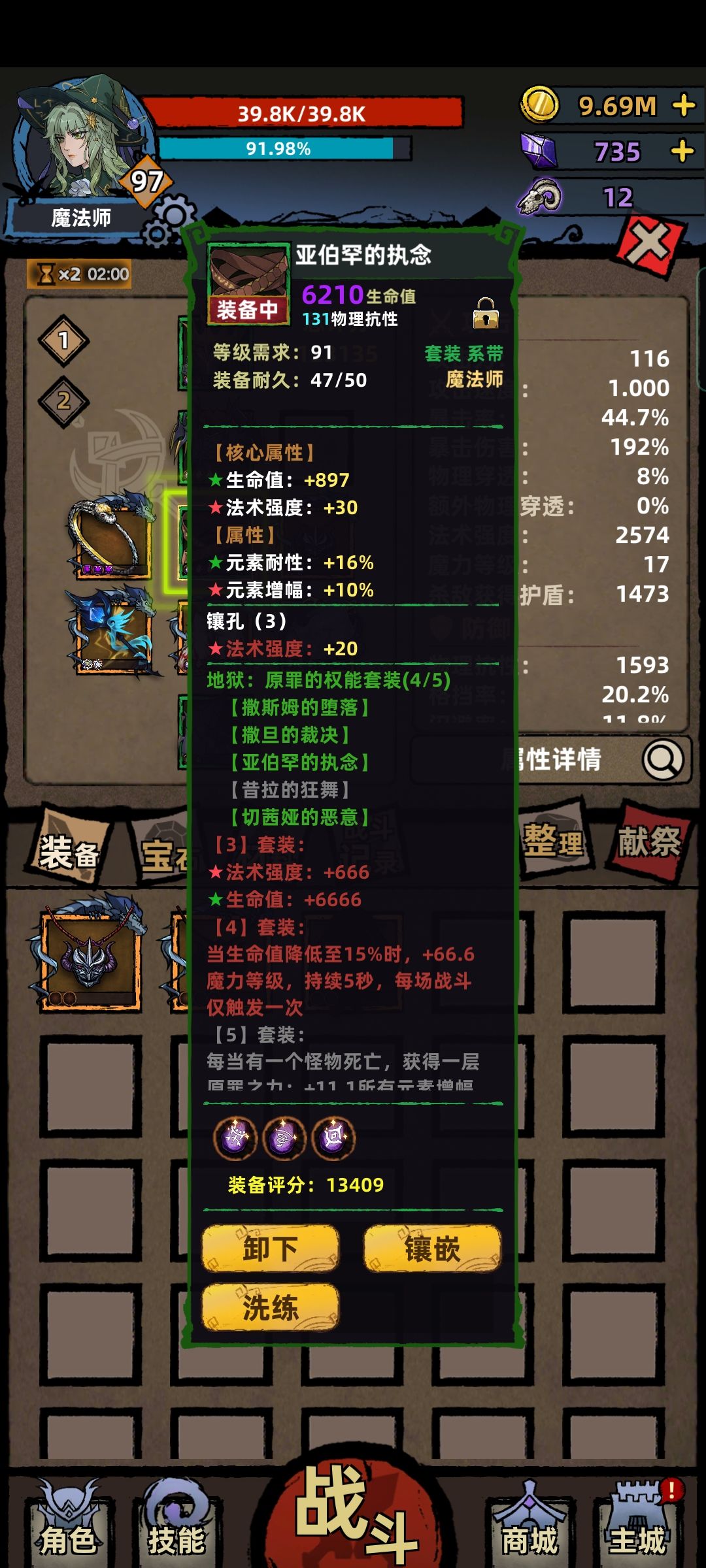 装备选择,前期凑两套三件套,火首饰套,加一把单手,几套套装效果都差不太多,宝石有啥打啥,我首饰全紫加经验。中期凑远古,全远古散件,副手我带了个玄武的传说,至今才13级,还不如普通副手,带他纯粹是好奇升满的属性,后期质变套装是90级玄武本兑换的法师套,脸黑换了十几个一条裤子没出,4件套装效果已经足够打穿3周目,5件更是质变。