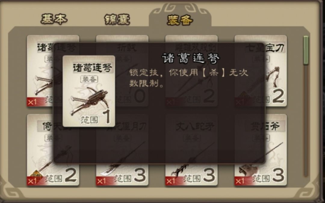 诸葛连弩的历史可谓很悠久了,古代历史上作为城防的武器,如今生活质量的提高,现代化大型重武器的发明创造,慢慢被时代落下,但其热度依旧不减,在各种手游,如塔防军争,三国杀等,又或者在动漫中都有借鉴其英姿,那我们今天来谈一谈三国杀中的诸葛连弩。
