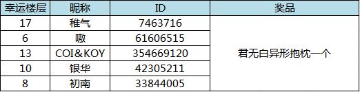 恭喜以下五位仙君大大,获得君无白异形抱枕一个,记得在5月28日前来找怀光兑奖哟!