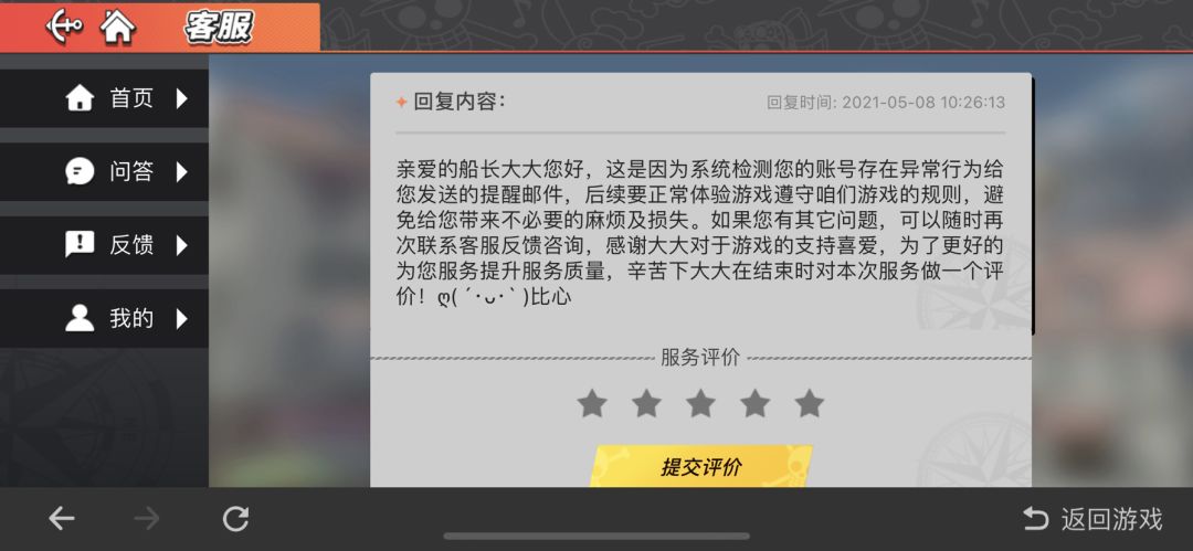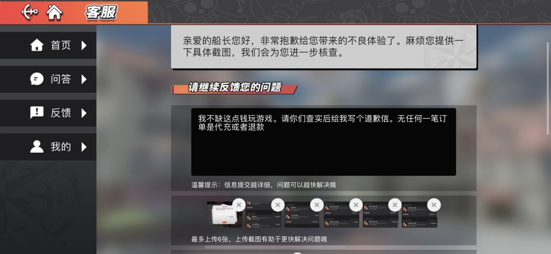 这个游戏就那么霸道?我所有充值均无任何一笔代充。所以充值均无任何一笔退款。游戏官方就这样对待玩家的吗?真正代充退款的你不去管。就检测我账号异常了?充钱进去还被你机器人当儿子?能不能玩了?大ip游戏。海贼王就这态度?