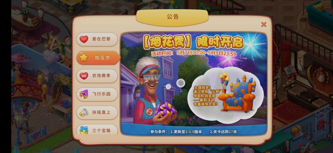 ②这是烟花秀活动的主界面,清晰的展示了每一个阶段任务所需的火箭数量以及所对应的阶段奖励。在最右侧是终极大奖的展示区,是一把美美的烟花椅子。