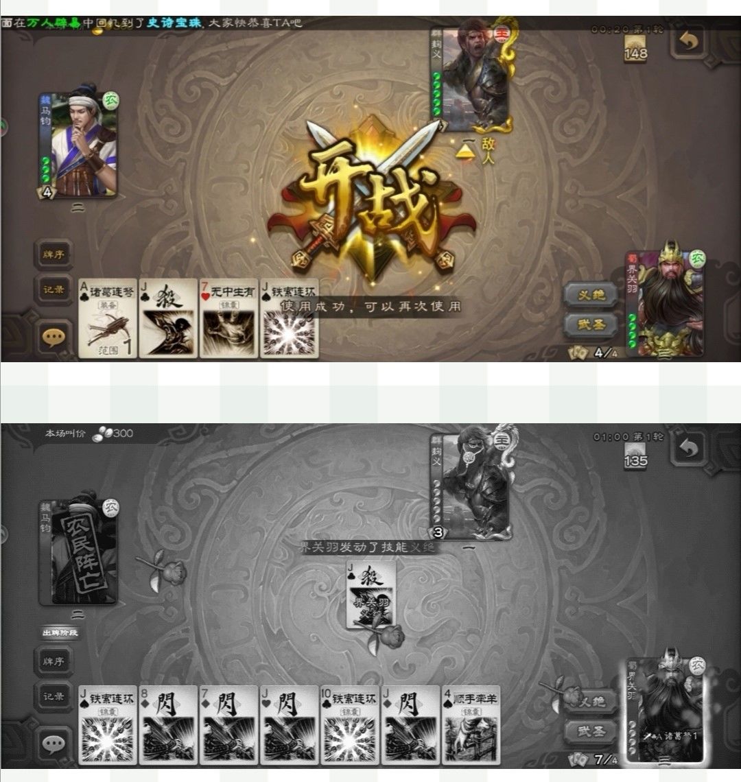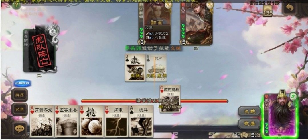 1.先义绝后过牌:很多玩家在玩武将时,喜欢先过牌,这确实是对大部分武将都适用。但对于二爷来说义绝要不锁牌锁技能,要不白嫖对面一红色牌(尤其是红色的无懈可击)。敌人可能会因为自信装备拉满,又或者手里恰巧红色无懈,选择头铁或交出此牌,此时二爷过锦囊牌就容易很多了。