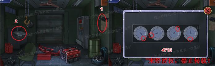 1、首先查看右边的墙壁上面的纸。发现奇怪的符号。实际上是几个对称数字组成的。数字为:4715。之后查看左边的柜子。进入密码的特写镜头,之后再次点击将它放大。按照如图所示的位置进行指针的摆放。1.11.2