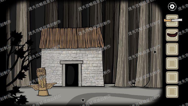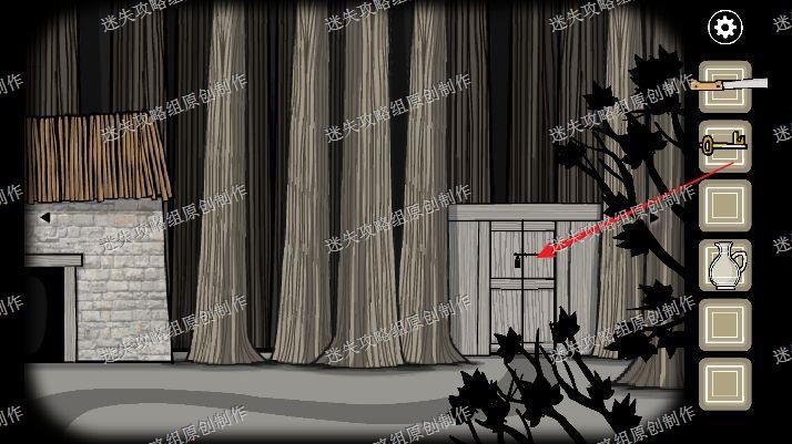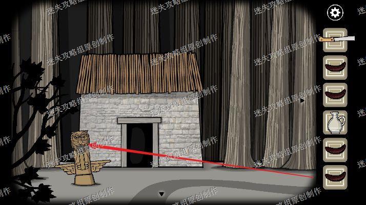 10.从房间退出,调查门口左下方的猫头鹰,把四条水蛭放入猫头鹰的嘴里,把翅膀往上拉,完成后拿到钥匙,用钥匙打开右边的木门,出现了一个黑色人影,点击两次进入锈湖中心。